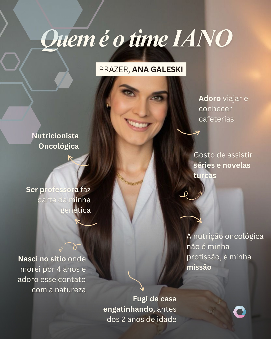 Sou Ana Galeski, idealizadora do Instituto IANO e movida pela paixão de transformar vidas através da nutrição. Ao longo de 12 anos de experiência, já estive ao lado de mais de 8 mil pacientes oncológicos, aprendendo com cada história e reafirmando todos os dias minha convicção: a alimentação é um aliado poderoso no tratamento, trazendo força, qualidade de vida e esperança. É esse propósito que me inspira a acolher cada pessoa de forma única e humana. Além do cuidado direto aos pacientes, também atuo como palestrante e mentora, compartilhando minha trajetória e conhecimento com outros profissionais. Acredito que, juntos, podemos elevar o padrão do cuidado em nutrição oncológica e multiplicar o impacto positivo na vida de tantas famílias que enfrentam o câncer.